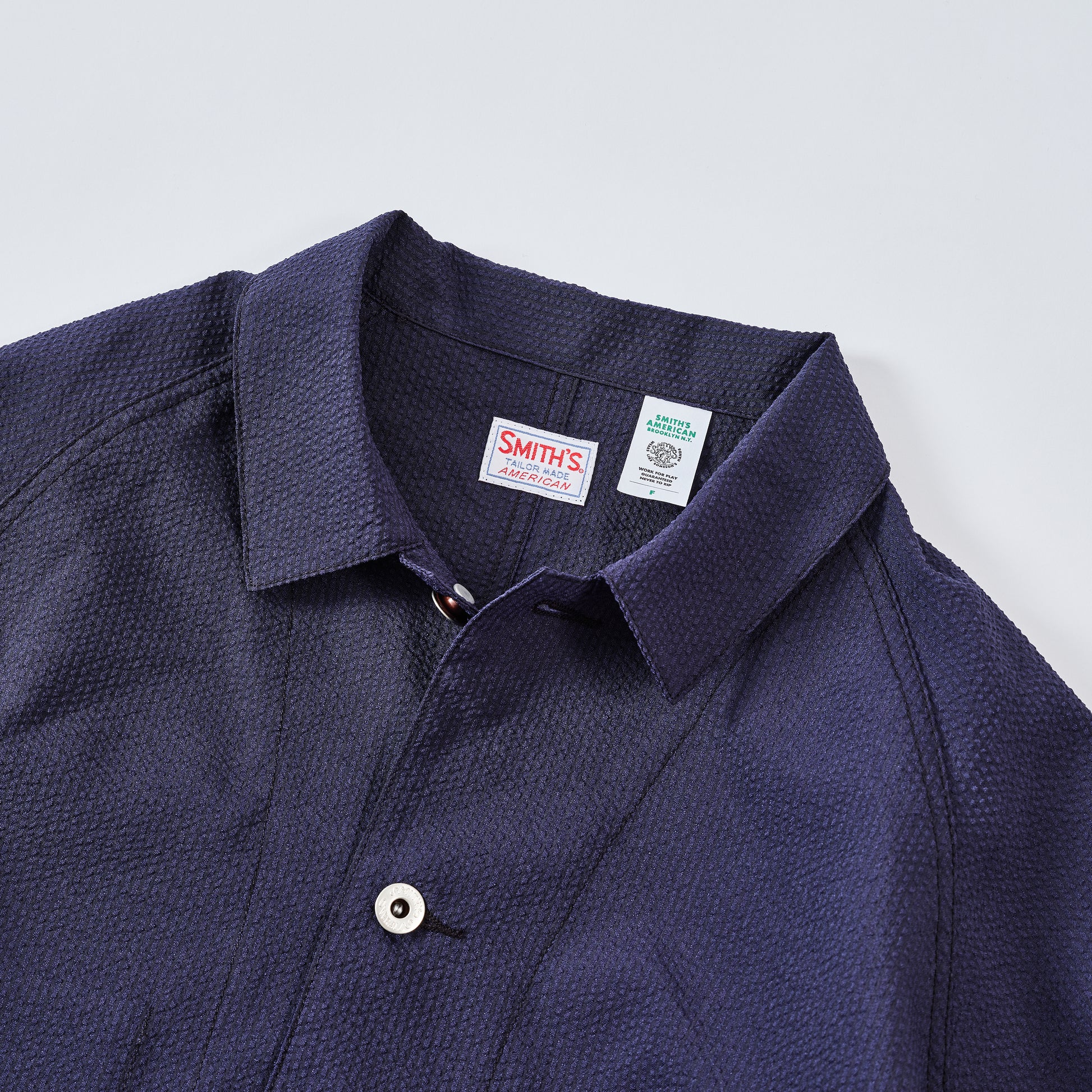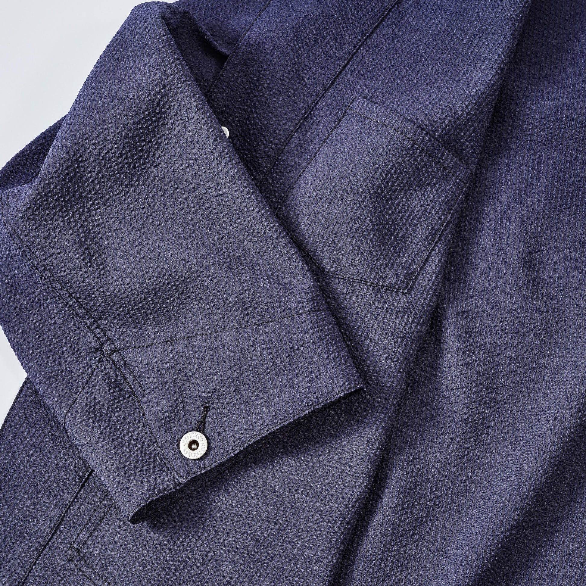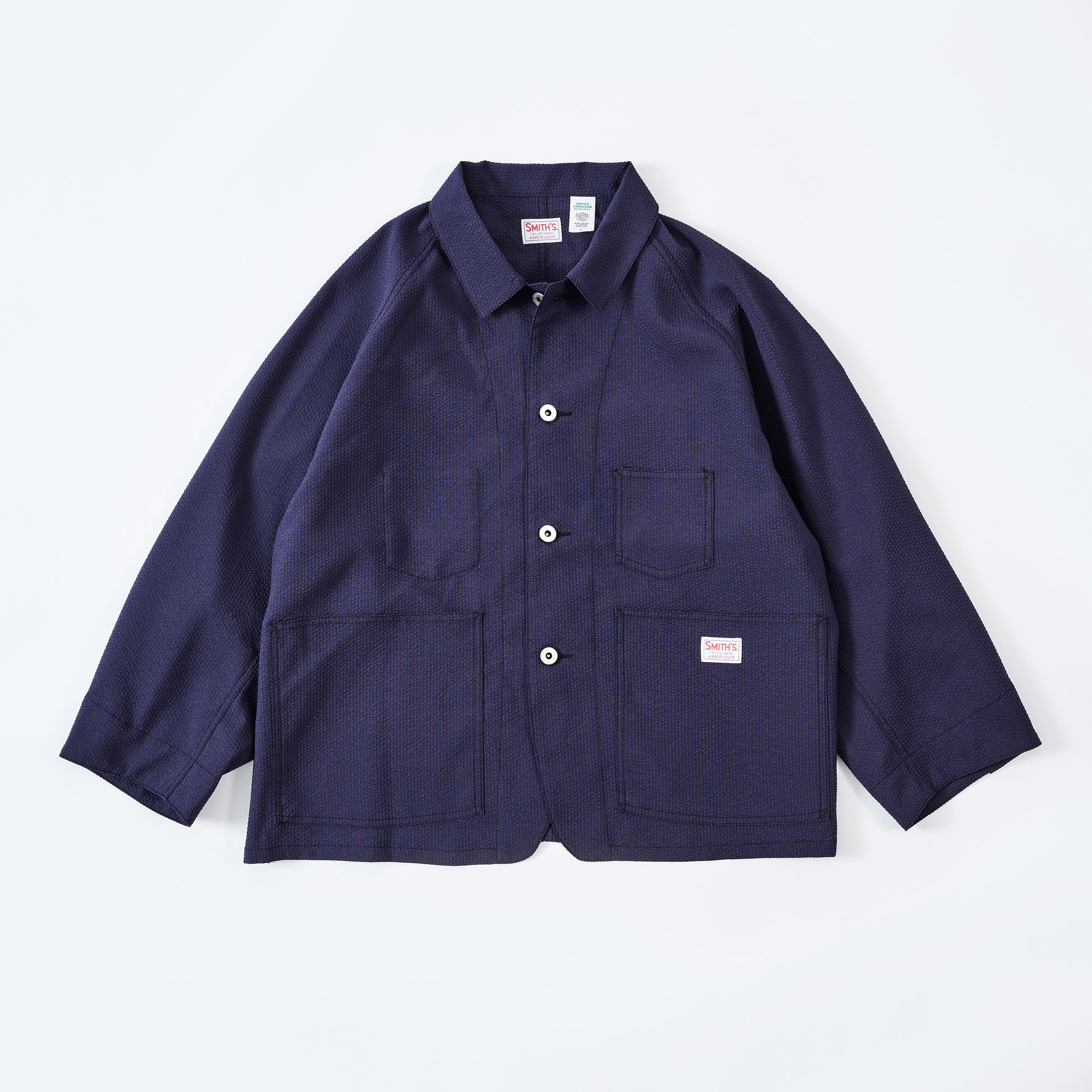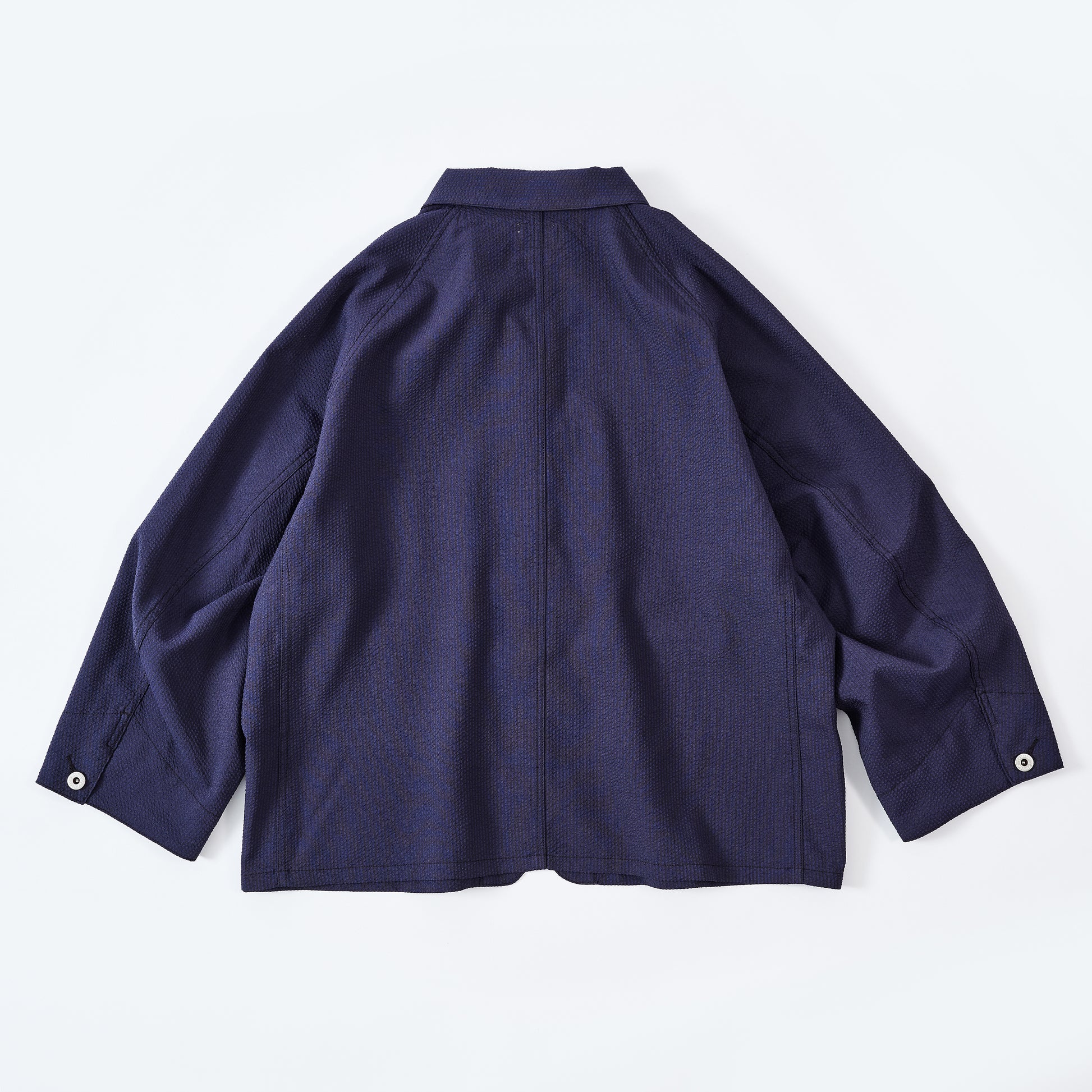 春夏シーズンに快適なポリエステルシアサッカーを使用したレディースサイズのカバーオールジャケット。オーセンティックなワークウェアのデザインとゆったりとした女性らしい袖周りのシルエットが魅力で、クリーンな印象の女性らしいジャケットです。