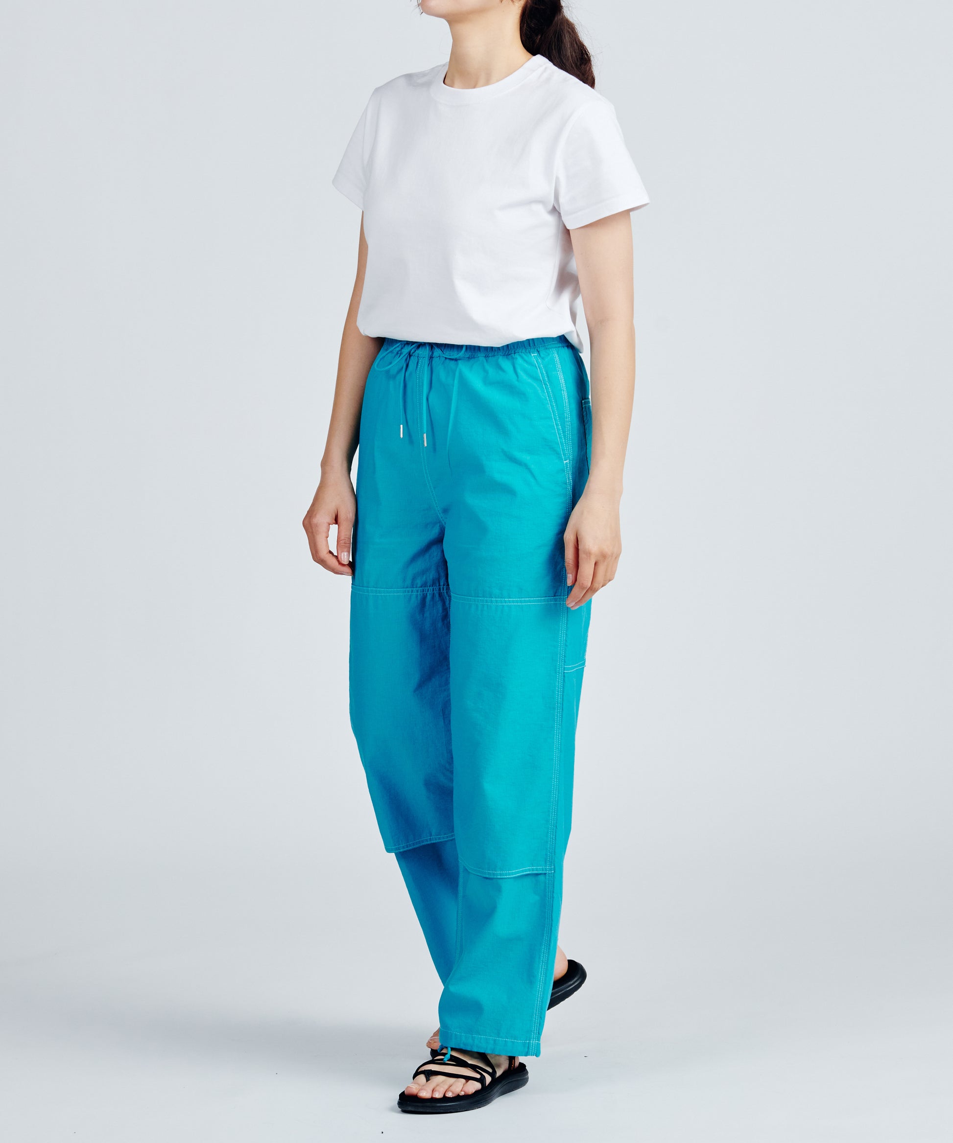 W/Knee work pants with a strong image are rearranged into women's relaxed pants with vivid colorways, cool fabrics and silhouettes, and colorful stitchwork, expressing the relaxed mood and colorful scenes unique to the West Coast beachside.