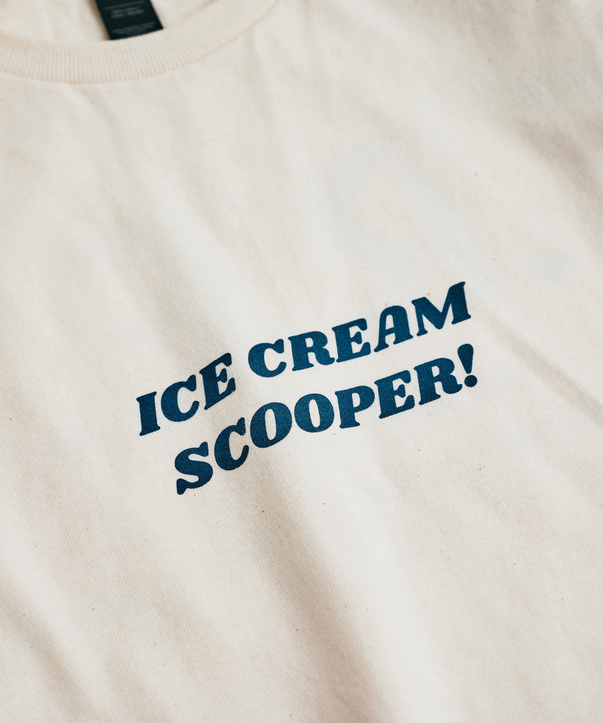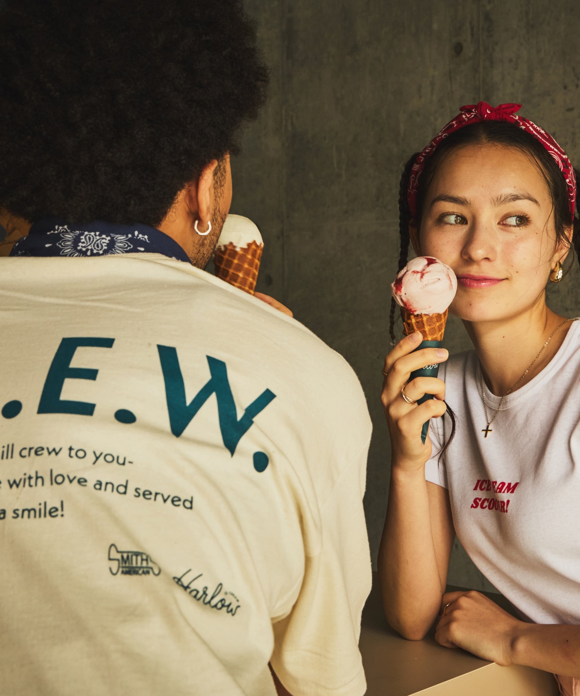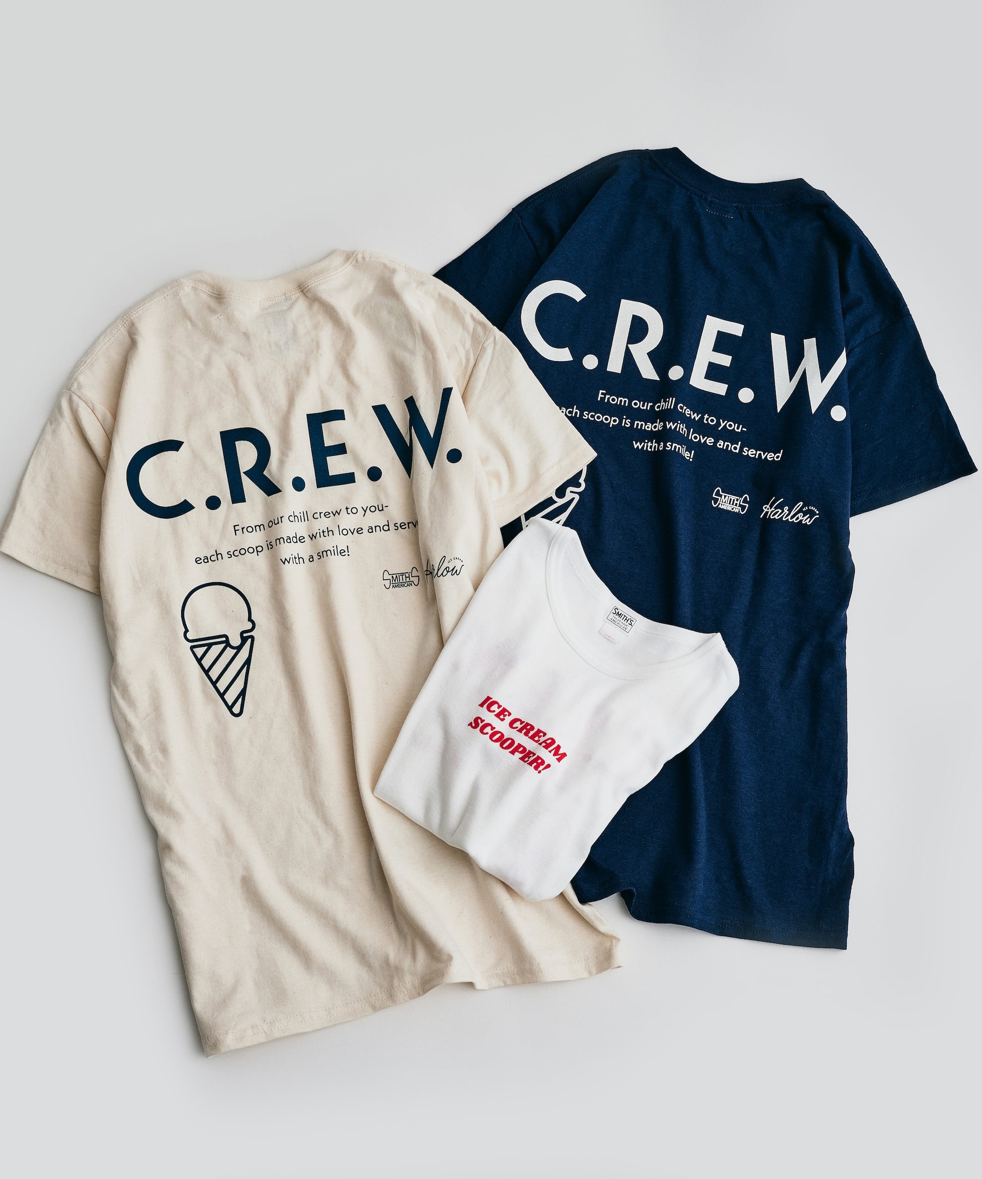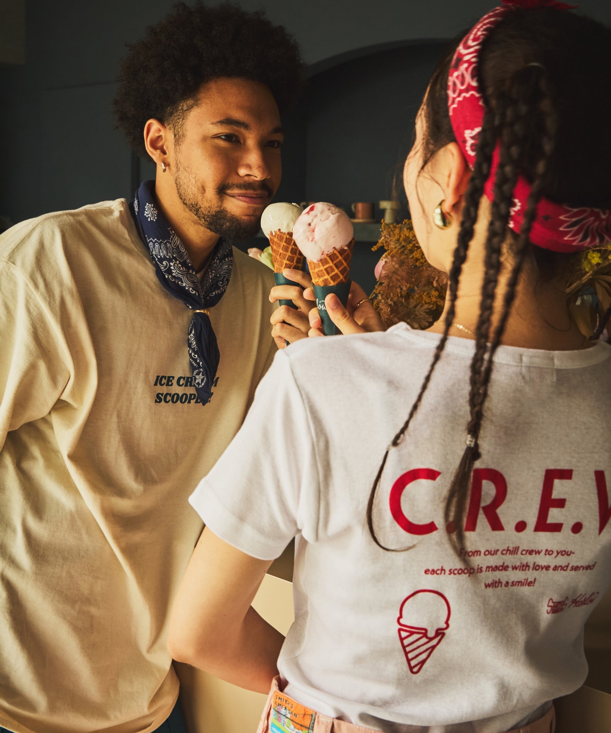 アメリカの古着店で見つけたタイポグラフィーをイメージソースに今回のコラボレーション用にデザインされたCREWやICE CREAM SCOOPERなどのグラフィックが前後に入ったSCOOPER TEE。エプロンを着用した際にも見えるように上気味に配置されたフロントプリントと、大胆なバックプリントが魅力。性別を問わずに着られるユニセックスフィットのcream, forestの2色と、レディースのタイトフィットのwhiteの計3色の展開。
