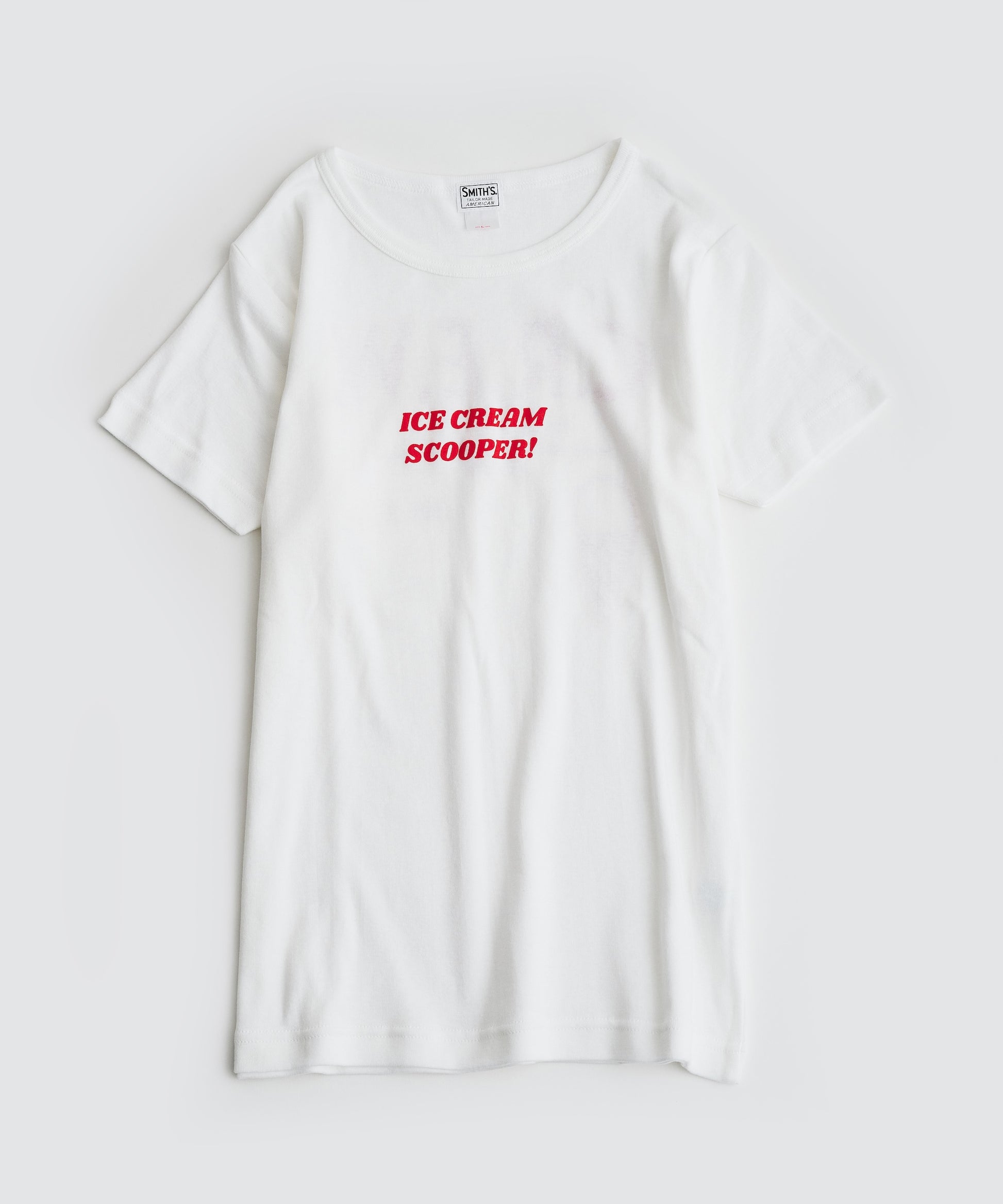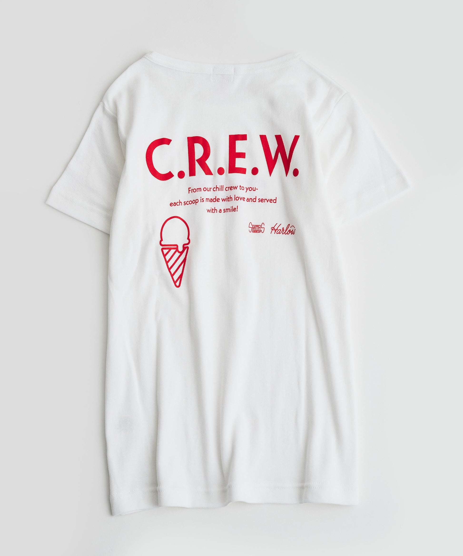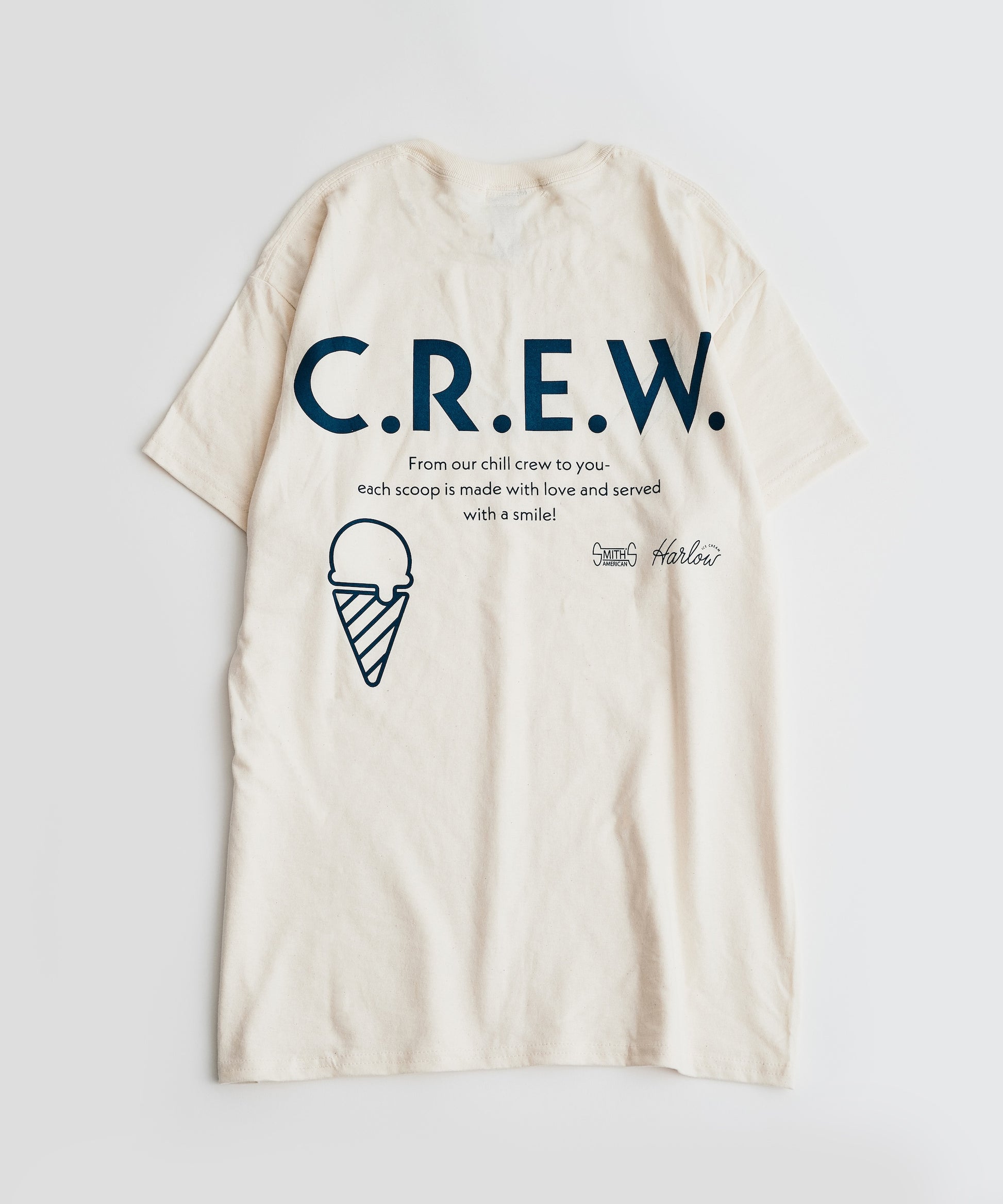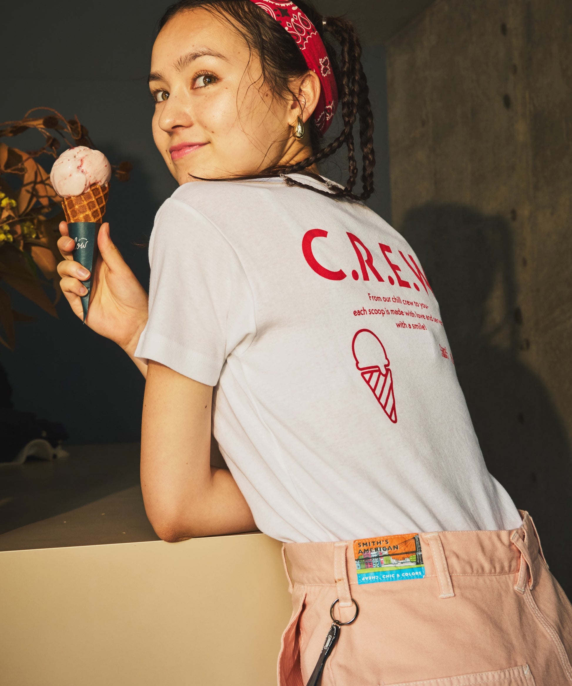 アメリカの古着店で見つけたタイポグラフィーをイメージソースに今回のコラボレーション用にデザインされたCREWやICE CREAM SCOOPERなどのグラフィックが前後に入ったSCOOPER TEE。エプロンを着用した際にも見えるように上気味に配置されたフロントプリントと、大胆なバックプリントが魅力。性別を問わずに着られるユニセックスフィットのcream, forestの2色と、レディースのタイトフィットのwhiteの計3色の展開。