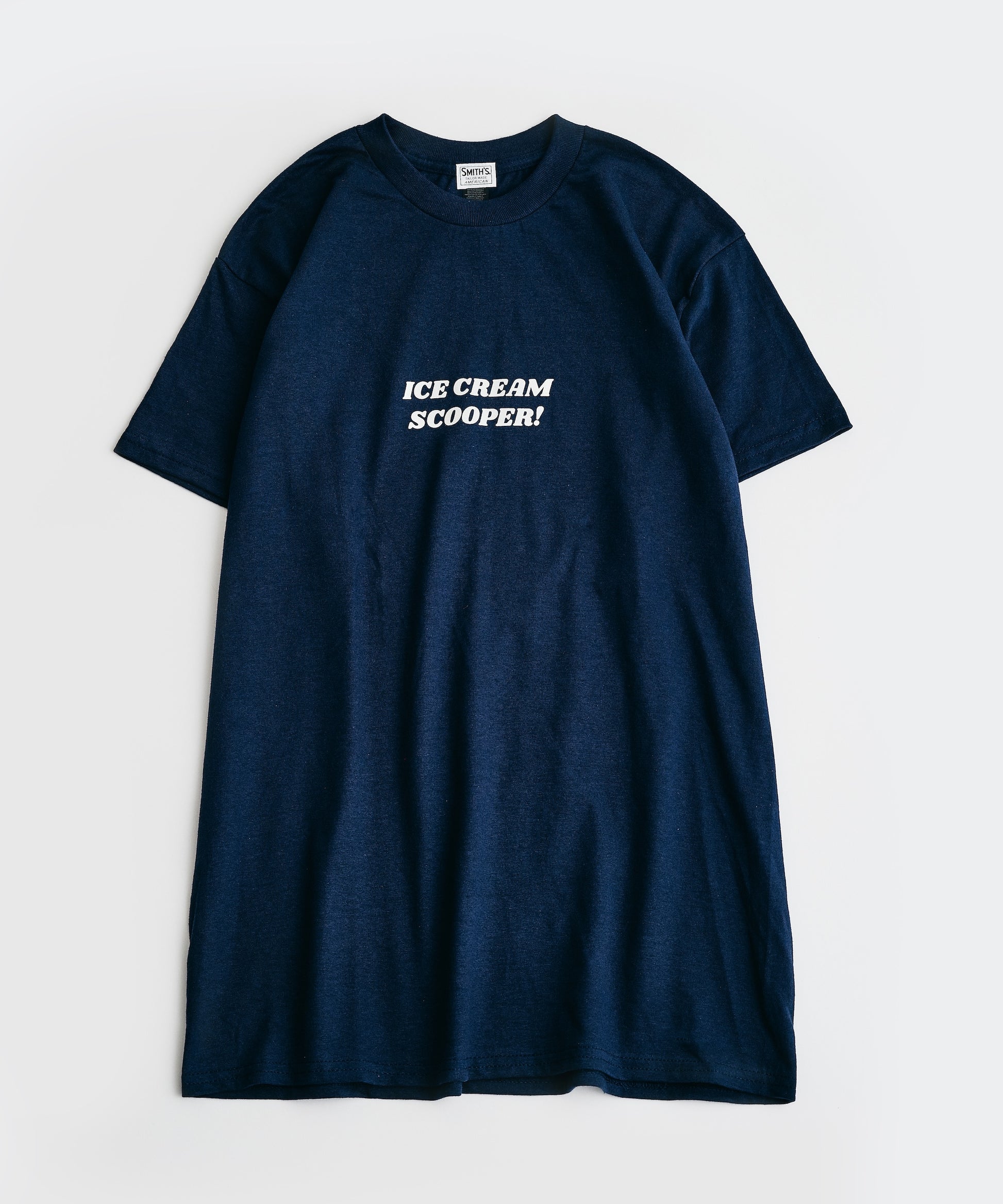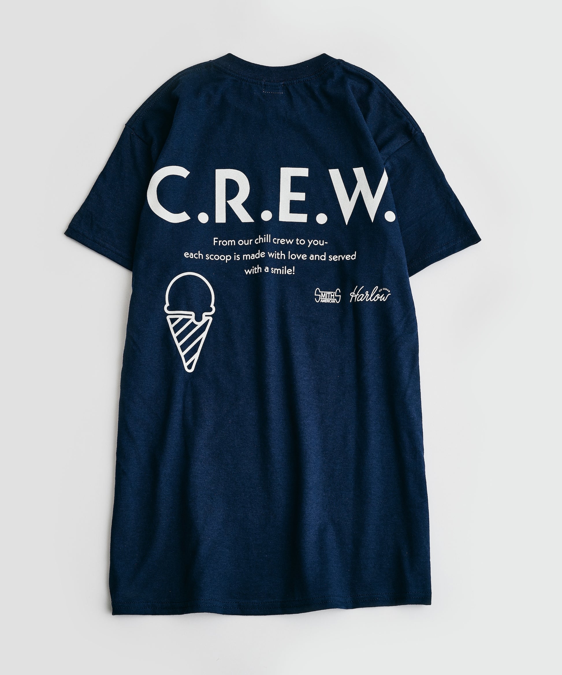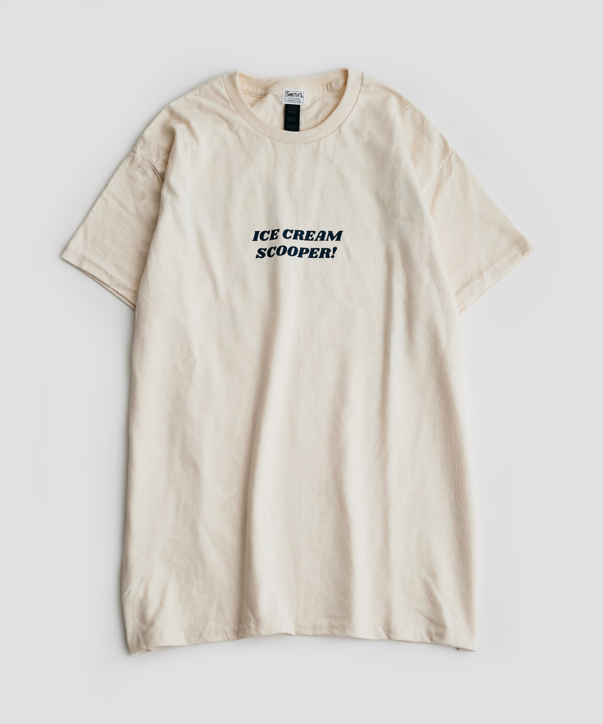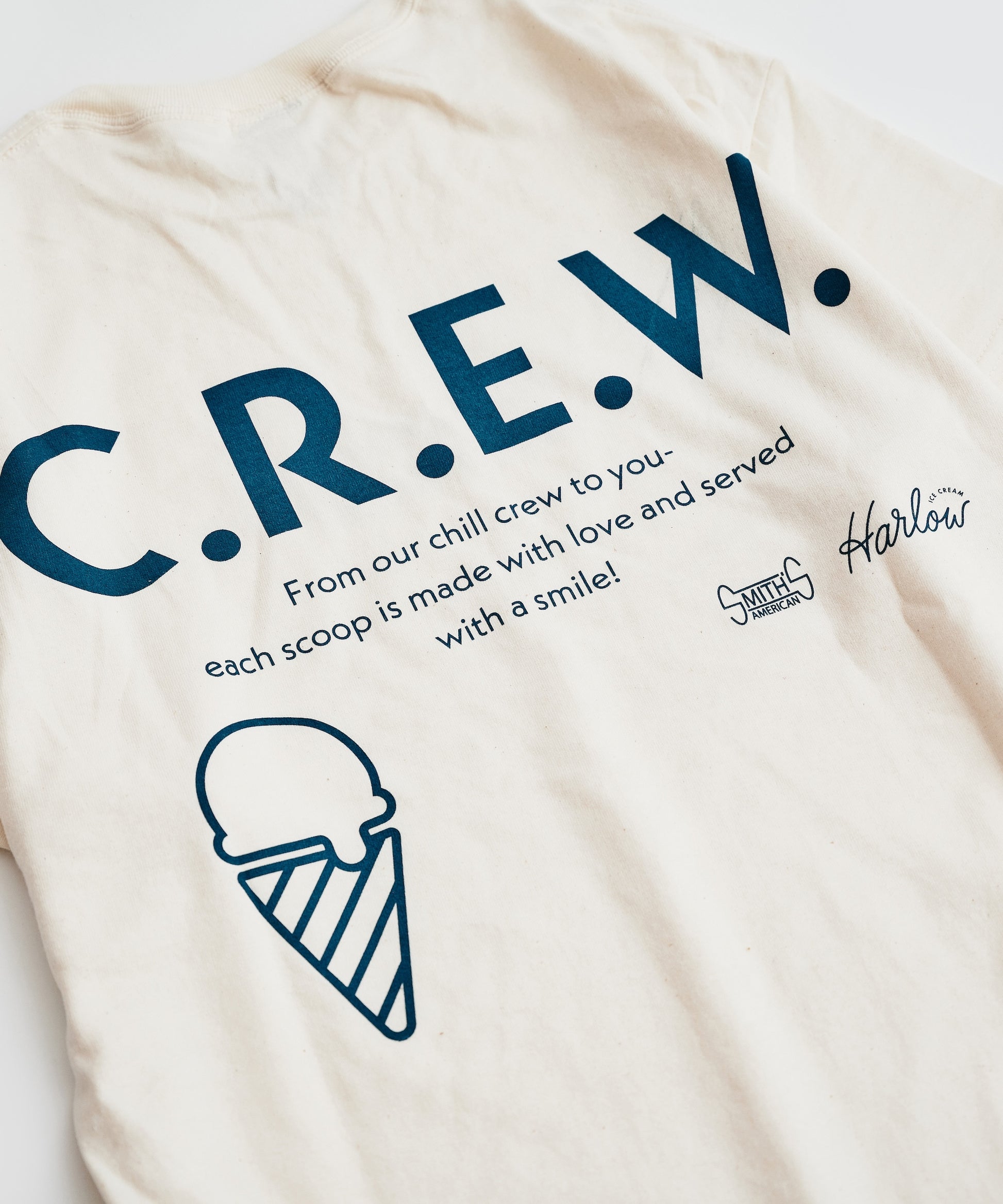 アメリカの古着店で見つけたタイポグラフィーをイメージソースに今回のコラボレーション用にデザインされたCREWやICE CREAM SCOOPERなどのグラフィックが前後に入ったSCOOPER TEE。エプロンを着用した際にも見えるように上気味に配置されたフロントプリントと、大胆なバックプリントが魅力。性別を問わずに着られるユニセックスフィットのcream, forestの2色と、レディースのタイトフィットのwhiteの計3色の展開。